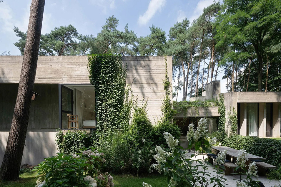 In Belgium, a humbler home by architect Marc Corbiau—also currently for sale—can be found in the countryside of Walloon Brabant. Designed in 1972, the house is enveloped by greenery that has been allowed to creep up and over its raw concrete forms. With the appearance of a romantic ruin, it is set low in the landscape, with the house and gardens seemingly merging into one. This softer approach to the architectural style, with details updated by interior designer Catleen le Hardy in 2018, shows a more livable version of Brutalism for today’s buyer, with low ceilings and intimately scaled living spaces.