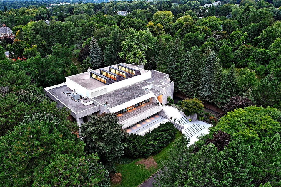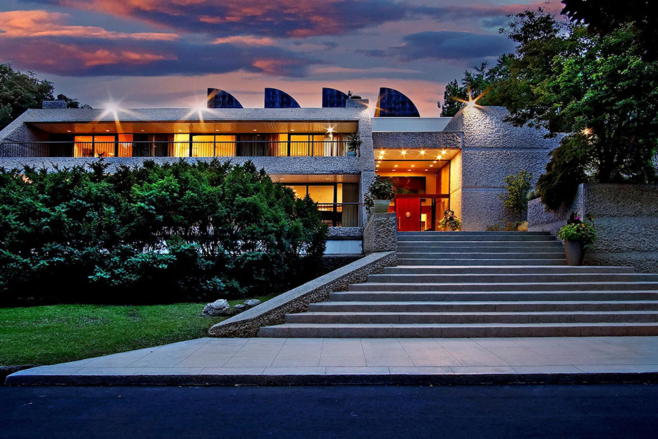 Canadian architect John C. Parkin’s 30 High Point Road, currently listed for sale in Toronto’s Bridle Path neighborhood, is an extraordinary example of how the style was used to exude wealth and status. Completed in 1976, the eight-bedroom mansion has a long flight of steps leading to its entrance, emphasizing a grandiose concrete structure that slopes dramatically to the ground. Inside, a four-story atrium floods the house with natural light, giving this home the quality of a museum or gallery more than a domestic space. Curtain walls of glazing—another Brutalist hallmark—make the property’s views of mature trees and landscaping a backdrop for living and entertaining.